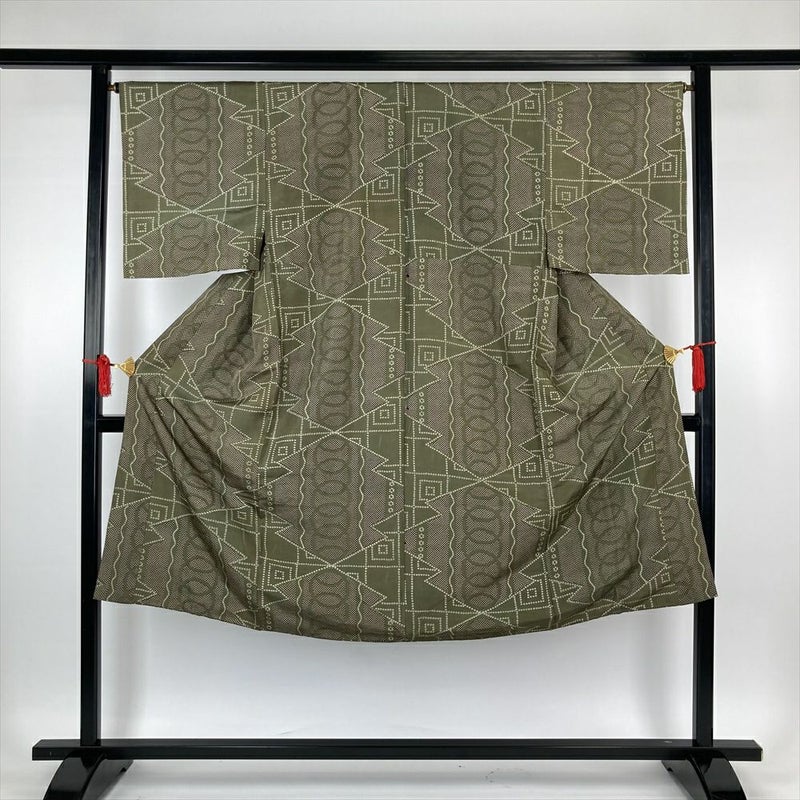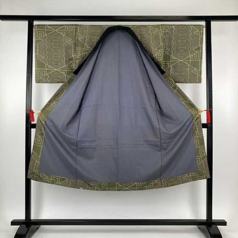 (中古)メンズリユース着物 長襦袢 緑 モスグリーン 幾何学模様 プリント絞り 絹 【身丈】132cm 【裄丈】66.5cm