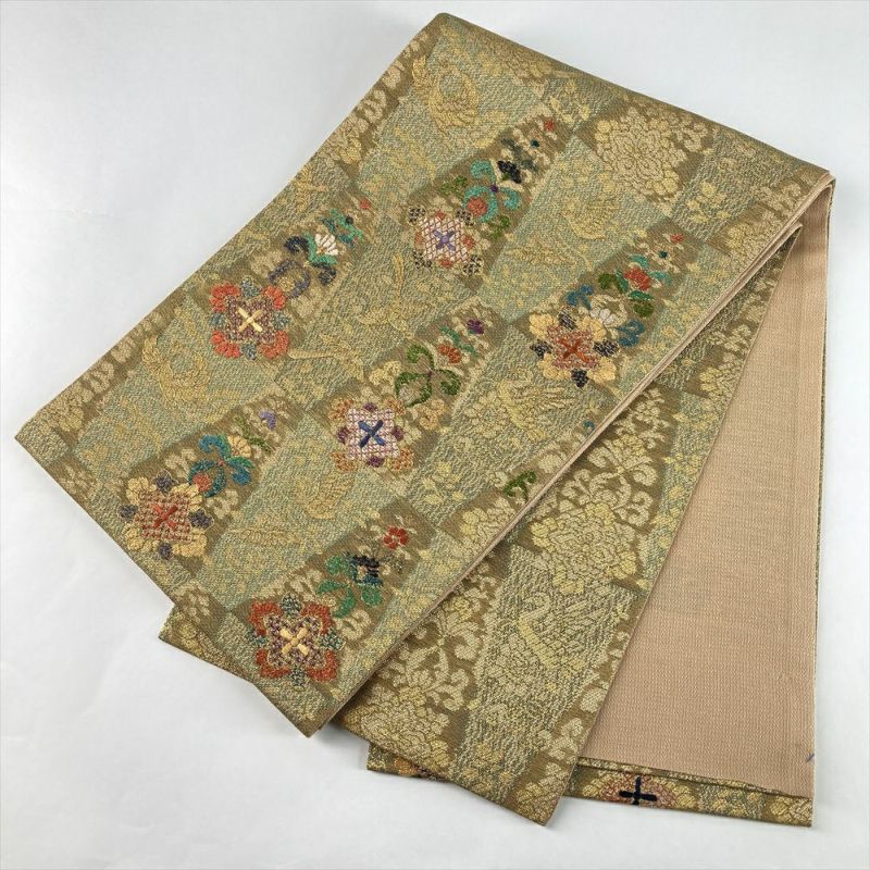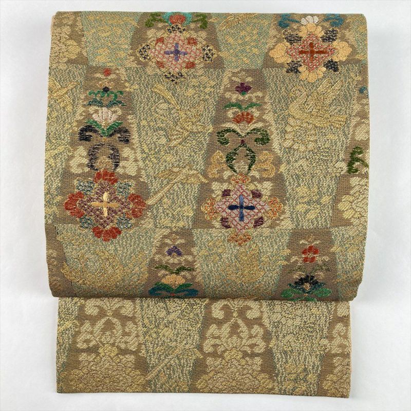 金駒刺繍で天平の花鳥を描いた袋帯。