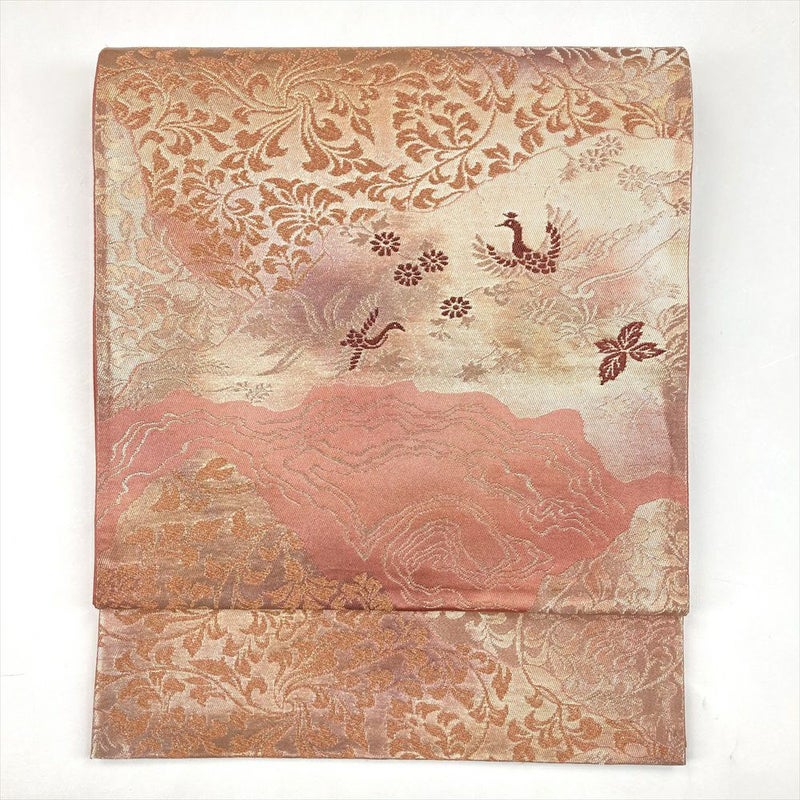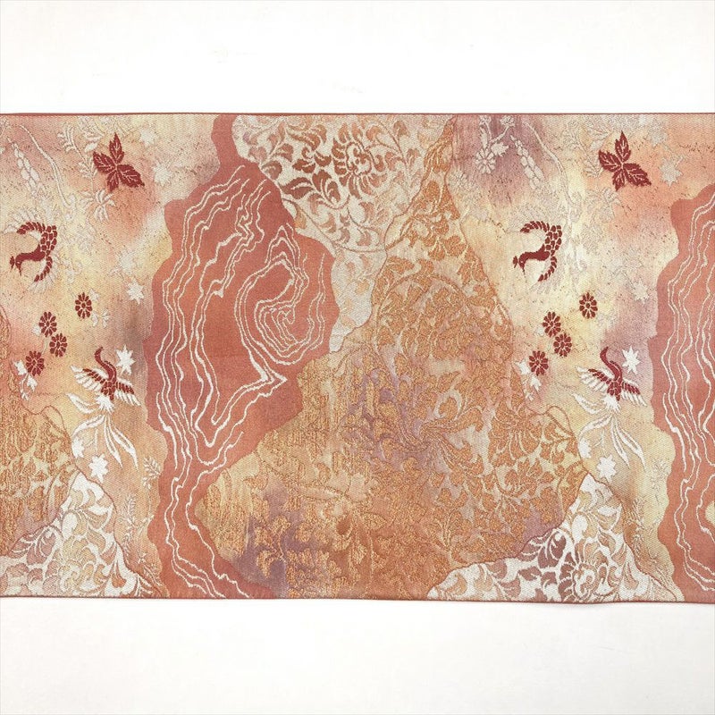 (中古)袋帯 紅梅色 ピンク セミフォーマル カジュアル 六通 切箔 金糸 色糸 霞取り 花唐草 天平文 花鳥