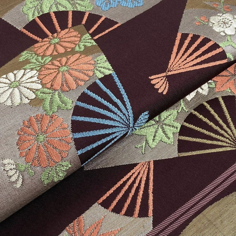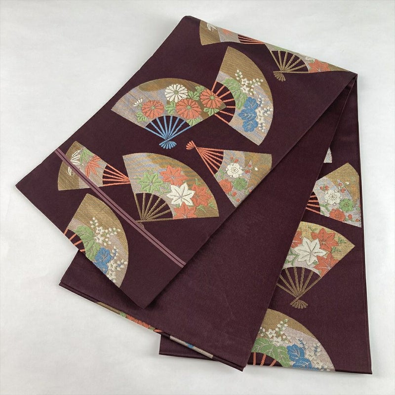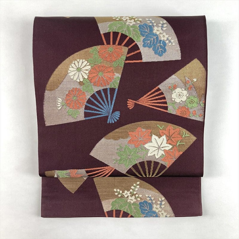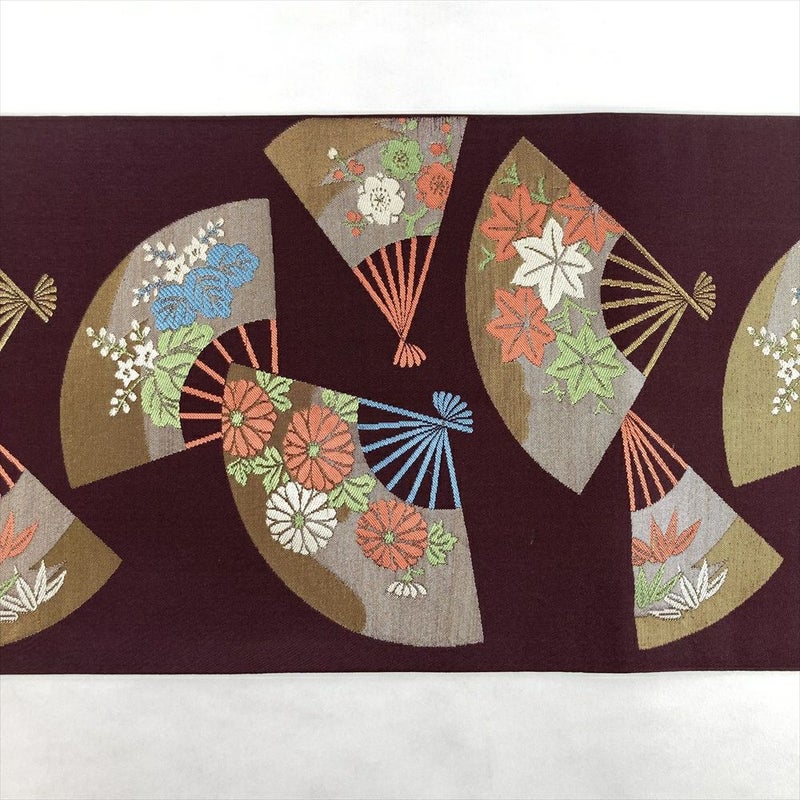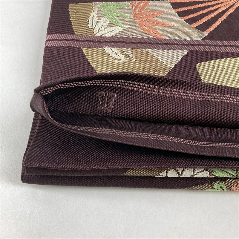 深みのある焦げ茶の地に、扇子文様と四季の花々が優雅に描かれた袋帯。