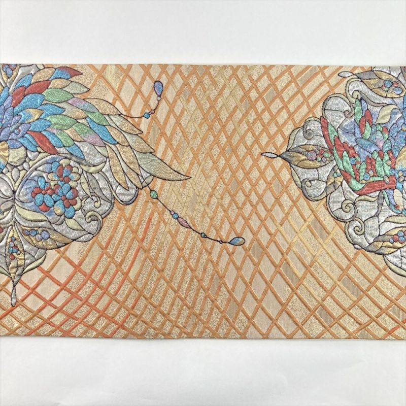 ふくれ織りで花鳥をステンドグラス調に表現した袋帯。