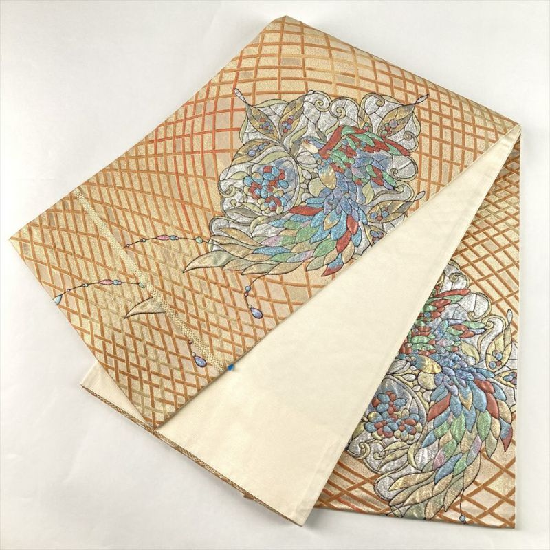 (中古)袋帯 金 セミフォーマル フォーマル 六通 ふくれ織り 花鳥 ステンドグラス調 絹