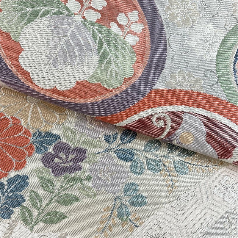 控えめな光沢の銀地に、優美な古典柄が繊細に織りなされ、着姿に品格と知的な華やぎを添えます。