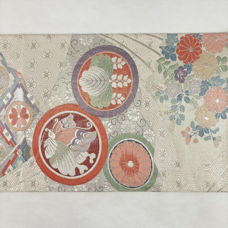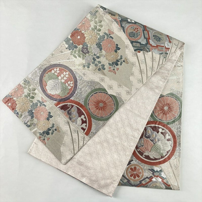 (中古)袋帯 銀 フォーマル セミフォーマル 六通 織り 中啓文 丸文 絹