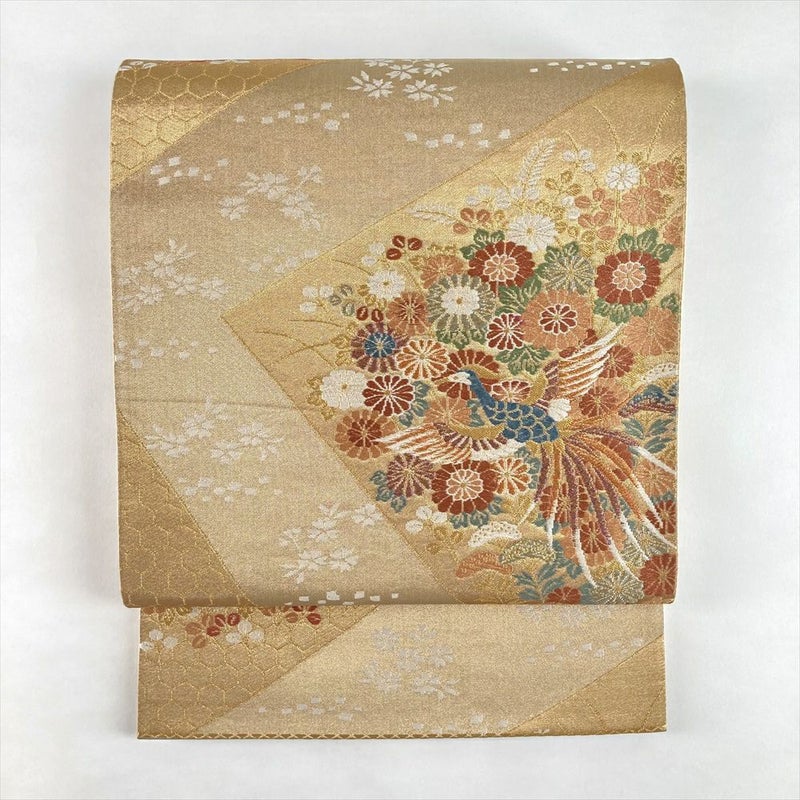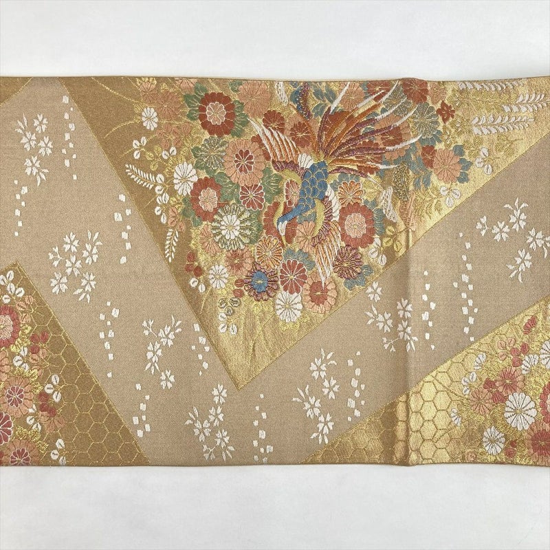 金色の地に、色紙文様の中で咲く花と舞う鳥が優美に織り込まれた一本。