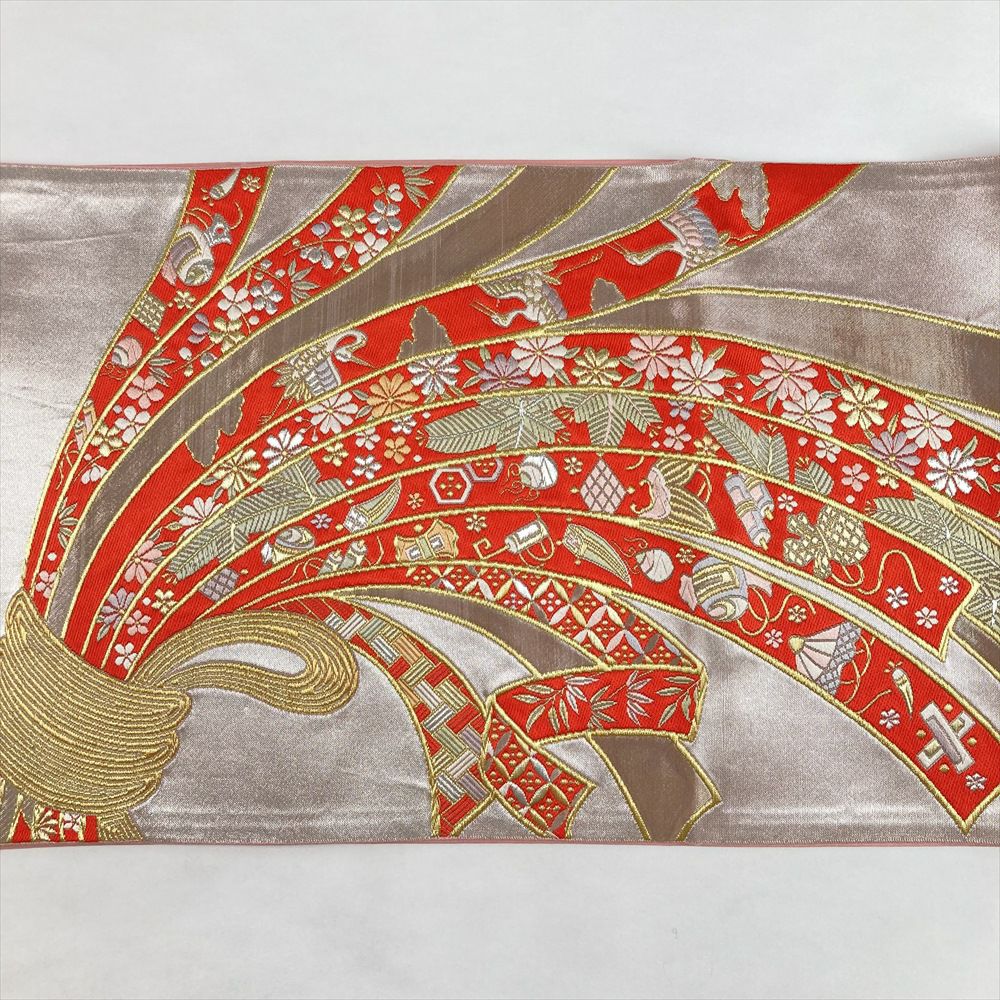 銀色の地に束ね熨斗文様が大胆に広がる袋帯。