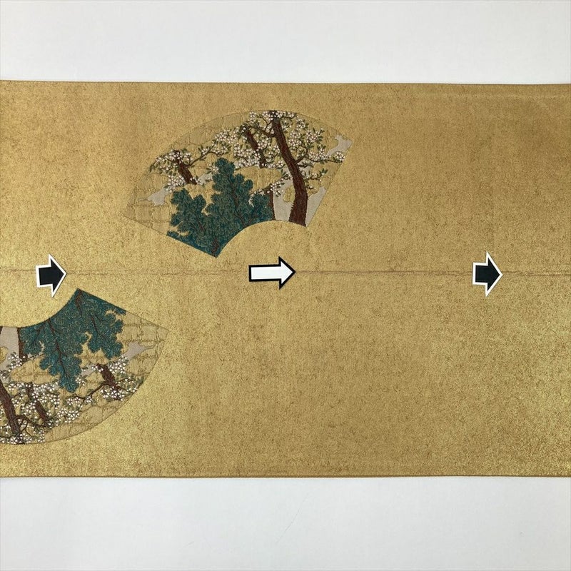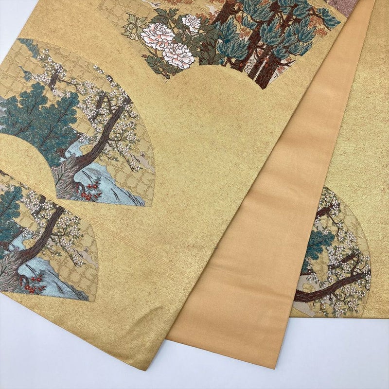 (中古)袋帯 金 フォーマル 六通 切箔 色糸 扇面に四季の草花 琳派調
