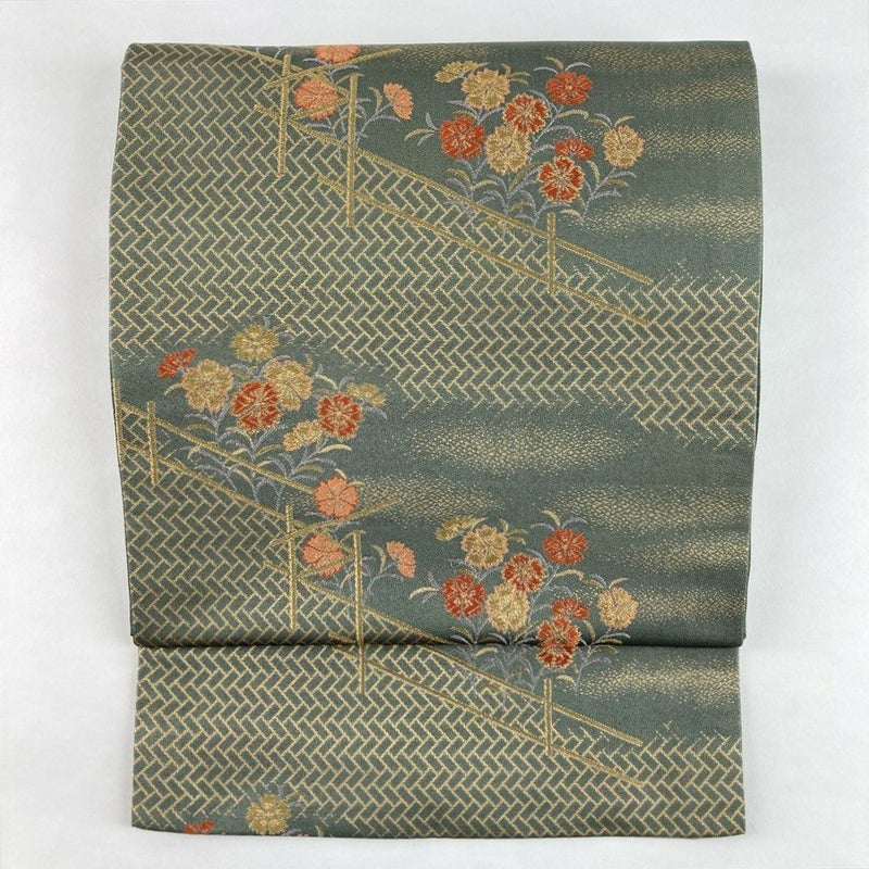 (中古)袋帯 灰緑 フォーマル セミフォーマル 六通 金糸 色糸 檜垣文 撫子 絹