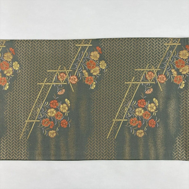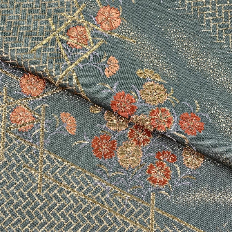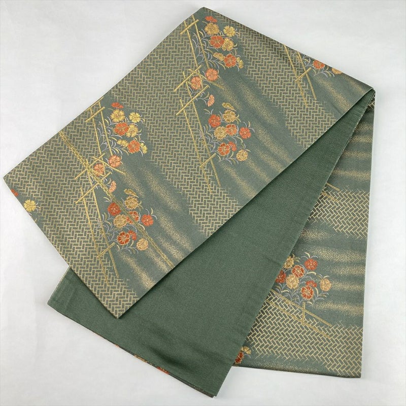 趣ある老竹色の地に、金色の桧垣文(ひがきもん)が織り出された袋帯です。
