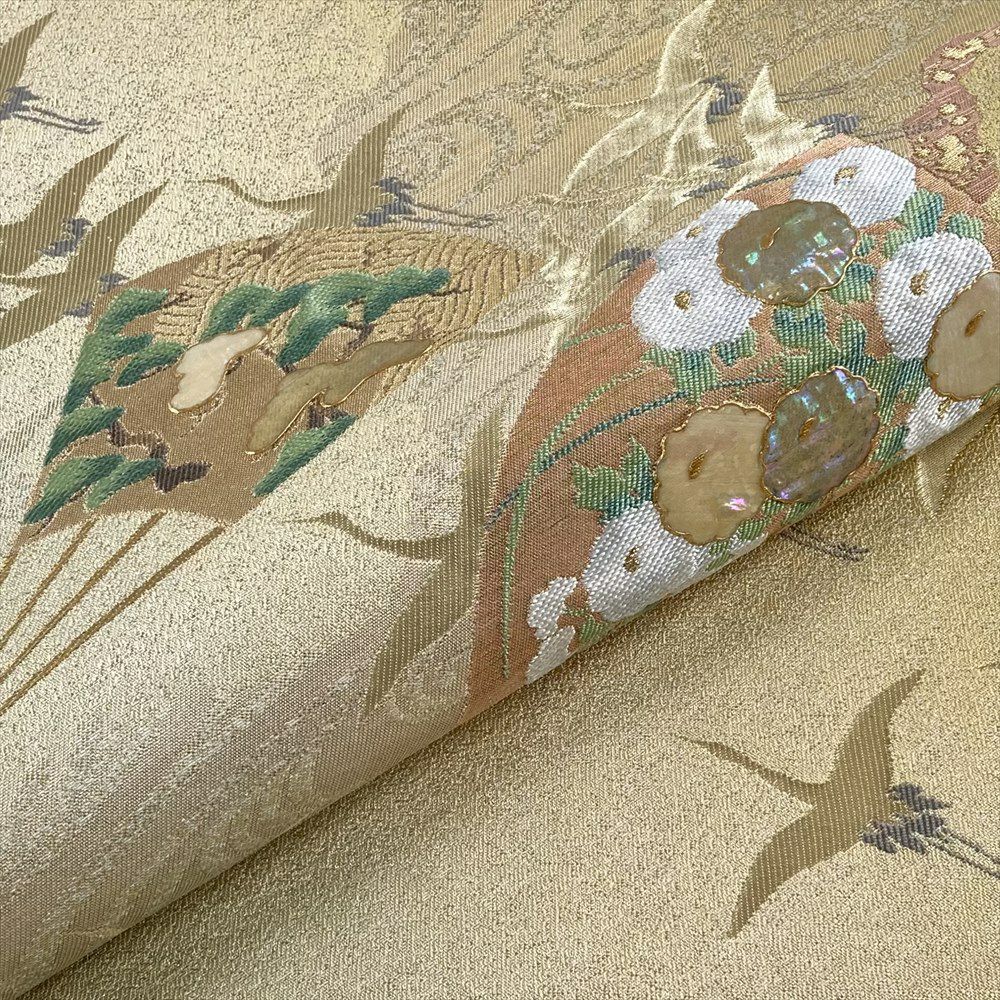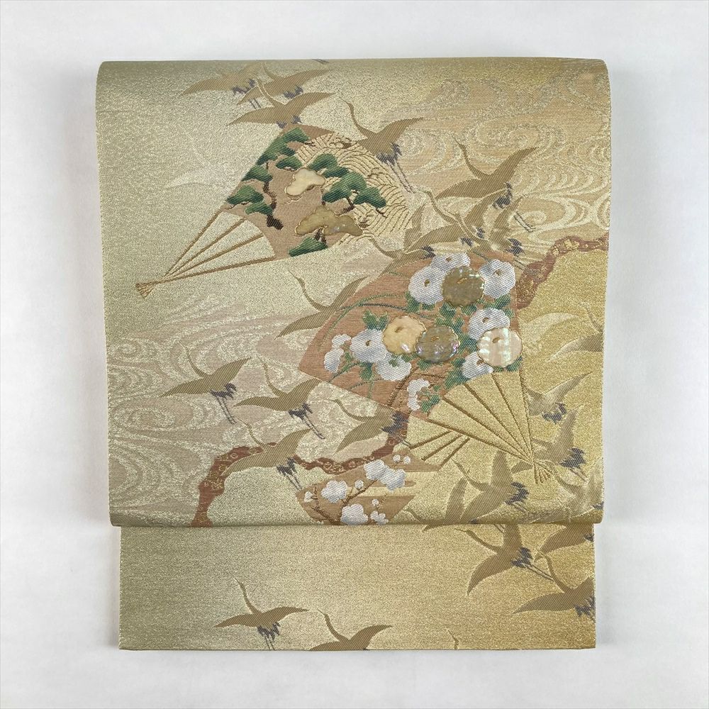 優雅に舞う鶴と、華やかな扇子のデザインが印象的な袋帯です。