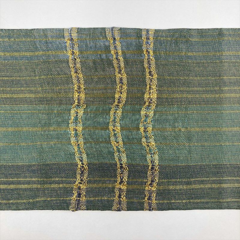 「組む、編む、織る」を駆使し、縦縞にモダンな模様があしらわれています。煌めきと華やぎ、スタイリッシュな帯です。カジュアルなシーンやしゃれた装いに向いています。一年を通して結ぶことが出来る、季節を問わない帯です。
