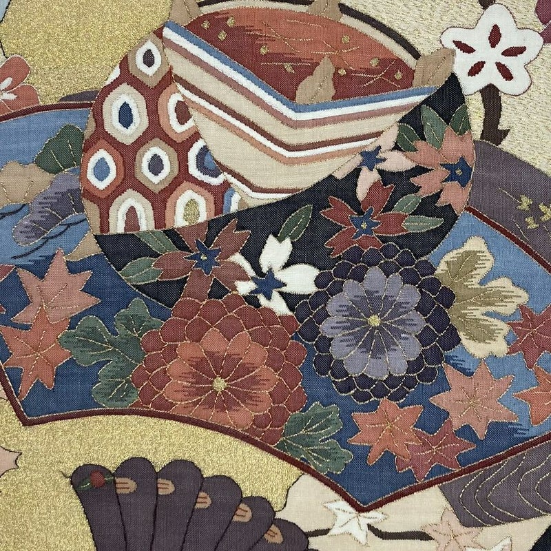 (中古)袋帯 金茶 フォーマル セミフォーマル 六通 金糸 色糸 扇面 巻物 糸巻き 四季の草花