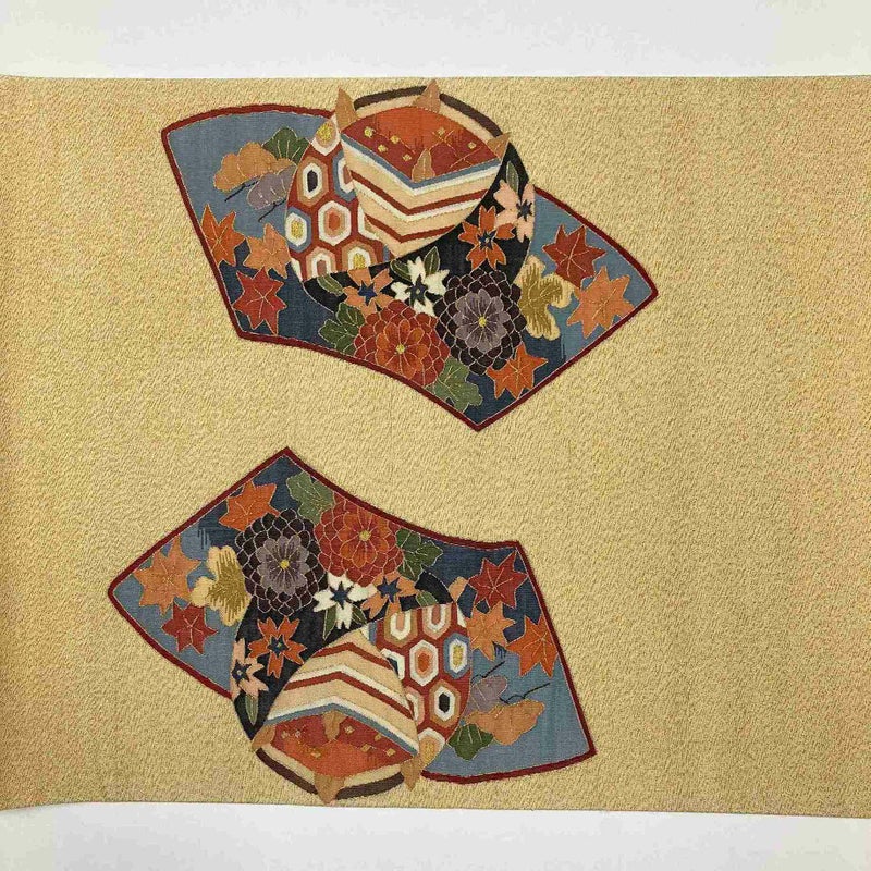 【色柄】金茶 フォーマル セミフォーマル 扇面 巻物 糸巻き 四季の草花 金糸 色糸 六通