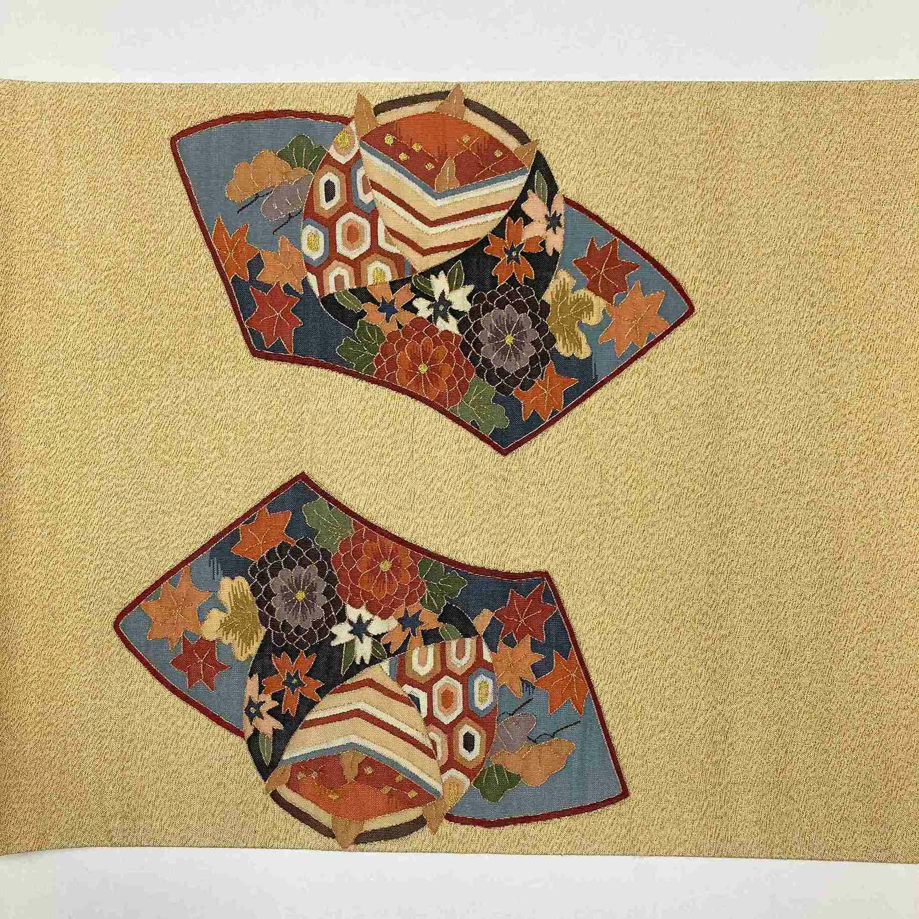 明綴れは、生地はしっかりしていますが細い糸が使用されるため柔らかく、生地にも模様にも厚みはありません。繊細で上品な印象を受けます。希少価値の高い逸品です。たたみシワがございます。保存臭がややございます。