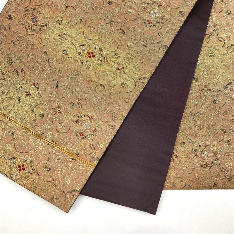 煌めく金糸銀糸、美しい色糸を使い織られた帯は、フォーマルな着物に合わせると華やかさが引き立ち、セミフォーマルな着物に合わせると格調高さをプラスすることができます。保存臭がございます。若干の使用感がございます。たれ裏に縫い取りがございます。