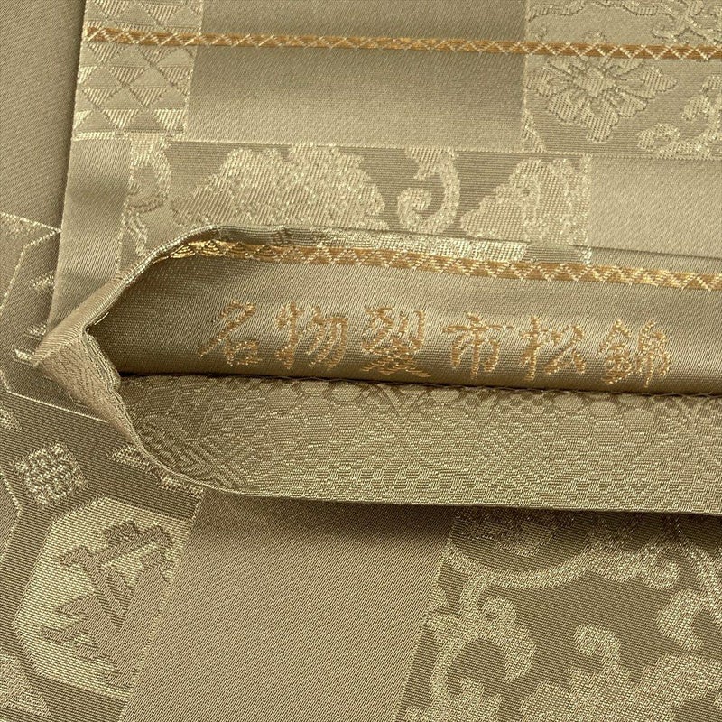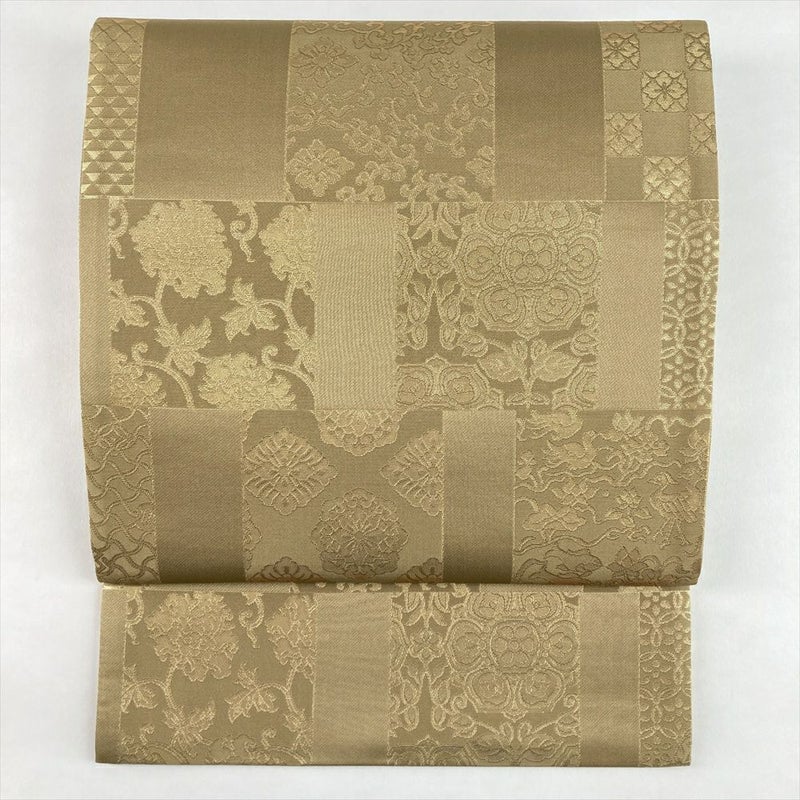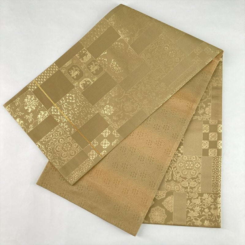 (中古)袋帯 金ベージュ フォーマル セミフォーマル 六通 織り 市松 名物裂 絹
