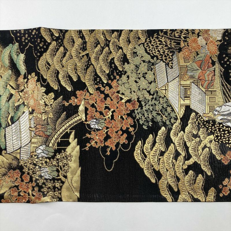 (中古)袋帯 黒 セミフォーマル フォーマル 六通 未仕立て 織り 松竹梅 平安絵巻 絹
