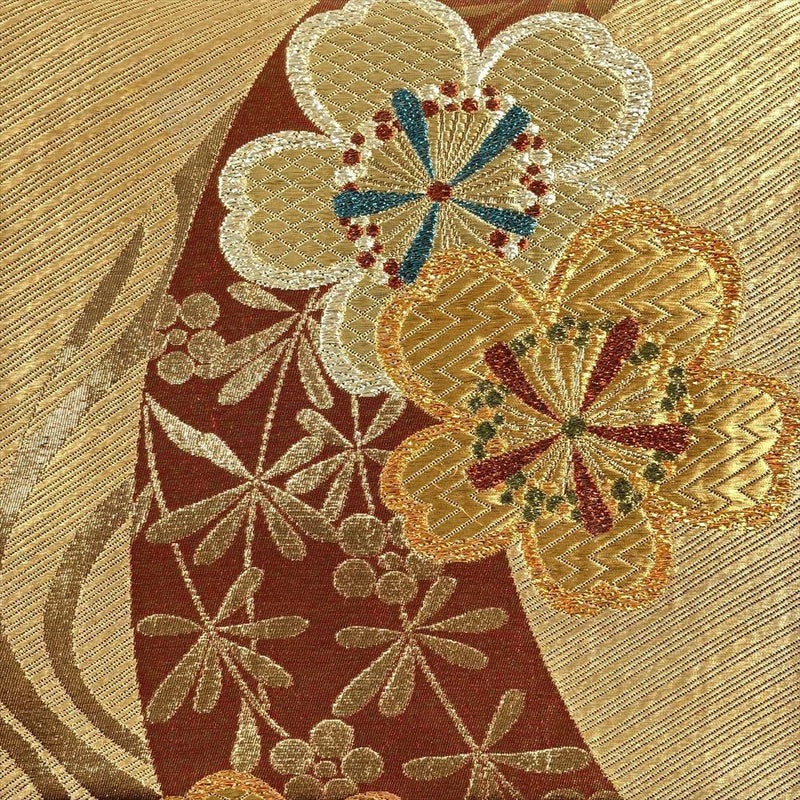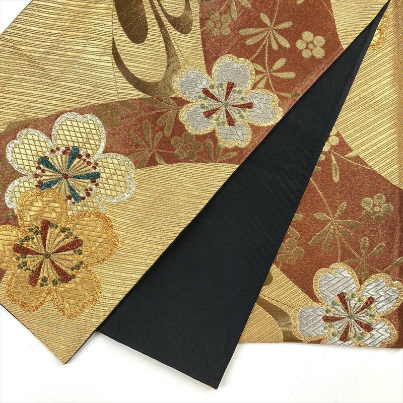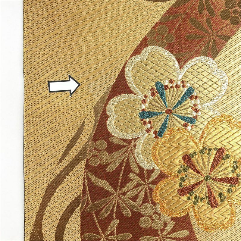 生地には程よい張りと柔らかさがあります、ふんだんに織り込まれた金糸に大小の桜が美しく、晴れの日の装いを華やかに彩ります。折りシワ締めシワなど若干の使用感がございます。保存臭がややございます。お太鼓に白い変色がございます。
