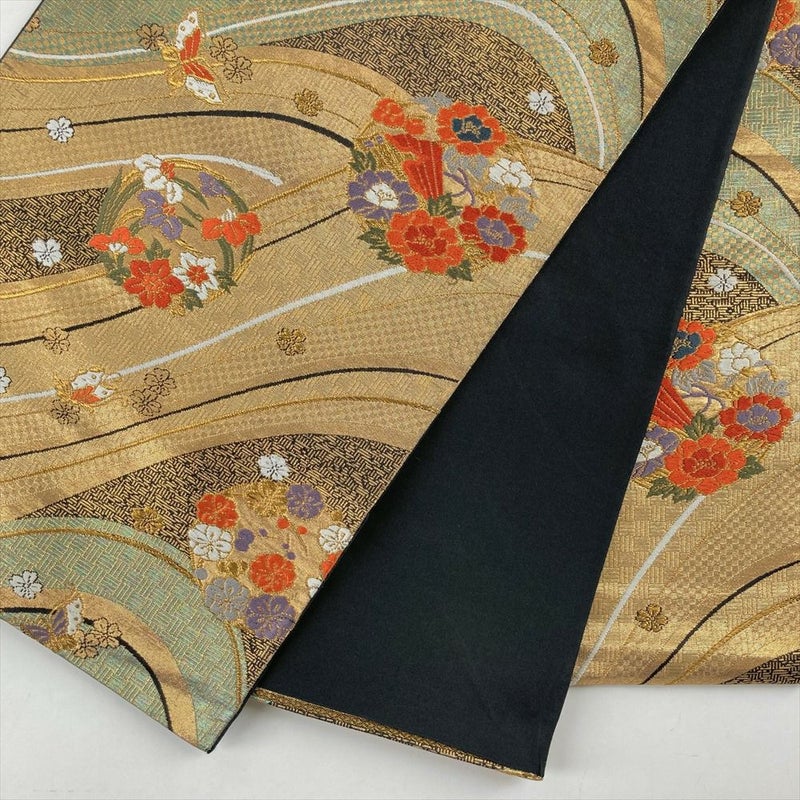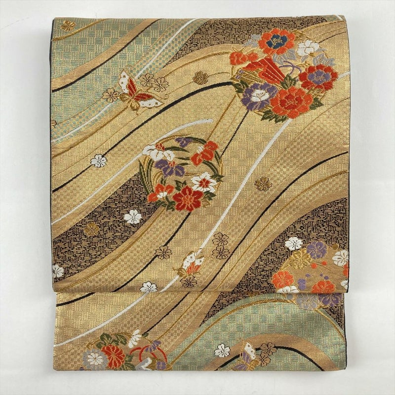 (中古)袋帯 金 フォーマル セミフォーマル 六通 切箔 金糸 色糸 花の丸 蝶 市松 算木崩し