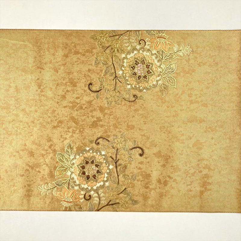 煌めく金糸銀糸、美しい色糸を使い織られた帯は、フォーマルな着物に合わせると華やかさが引き立ち、セミフォーマルな着物に合わせると格調高さをプラスすることができます。中無地に折りシワと汚れがございます。保存臭がややございます。若干の使用感がございます。
