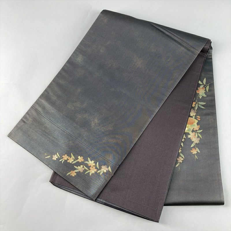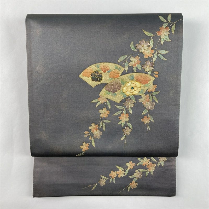 (中古)袋帯 緑 グレー セミフォーマル 六通 織り 扇面 四季花 絹