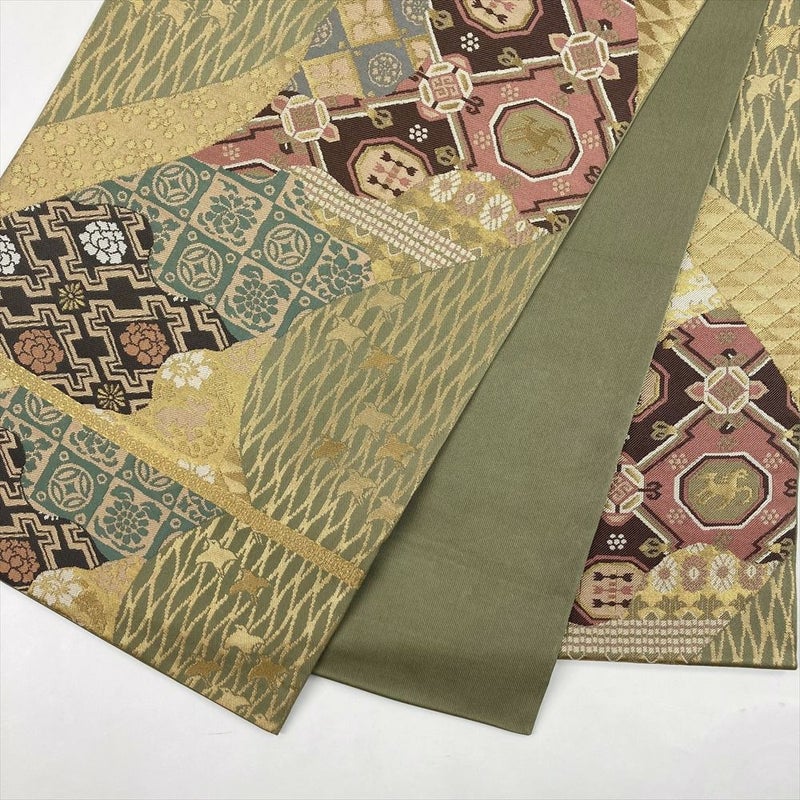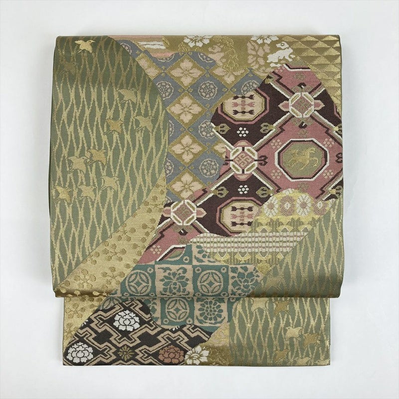 (中古)袋帯 金 灰緑 フォーマル 全通本金箔本袋 遺宝名物和州文 裂取り 吉祥文 千鳥 蜀江