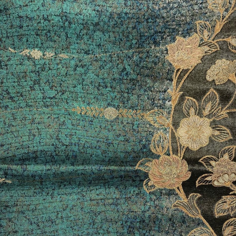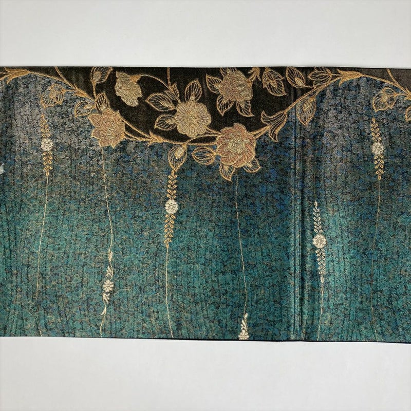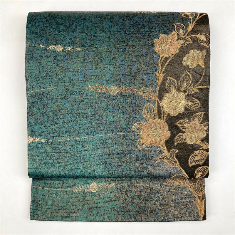 エメラルドグリーン×金の美しさ、特徴あるデザインをご堪能ください、セミフォーマルからカジュアルに合わせる、しゃれ帯です。保存臭がややございます。若干の使用感がございます。