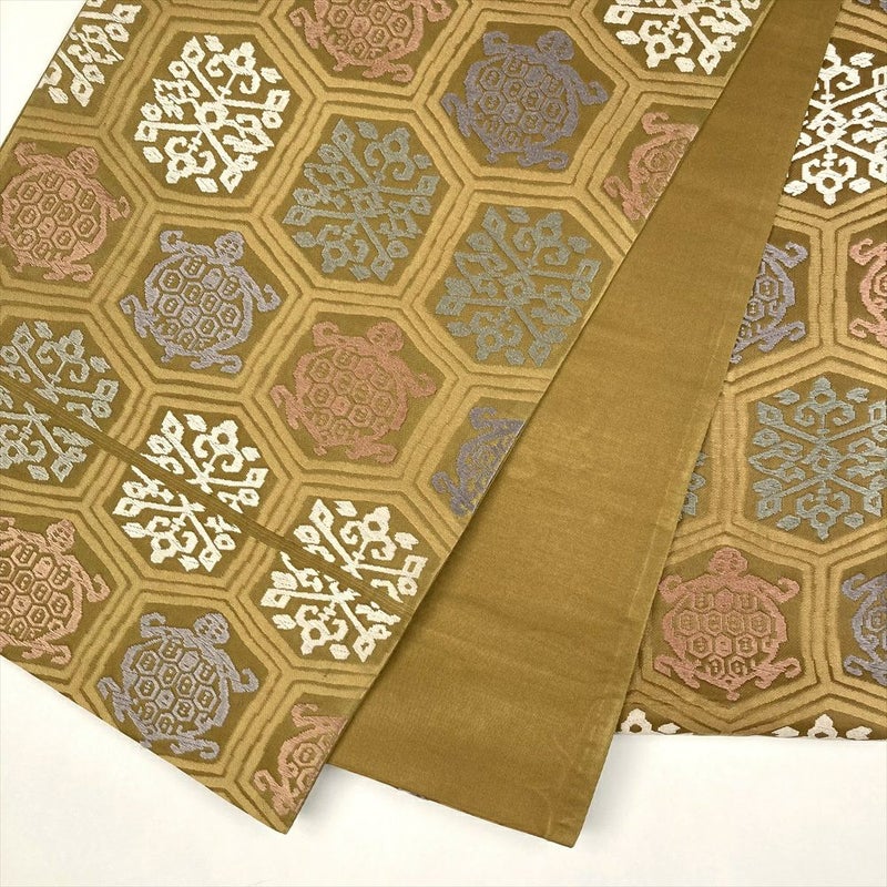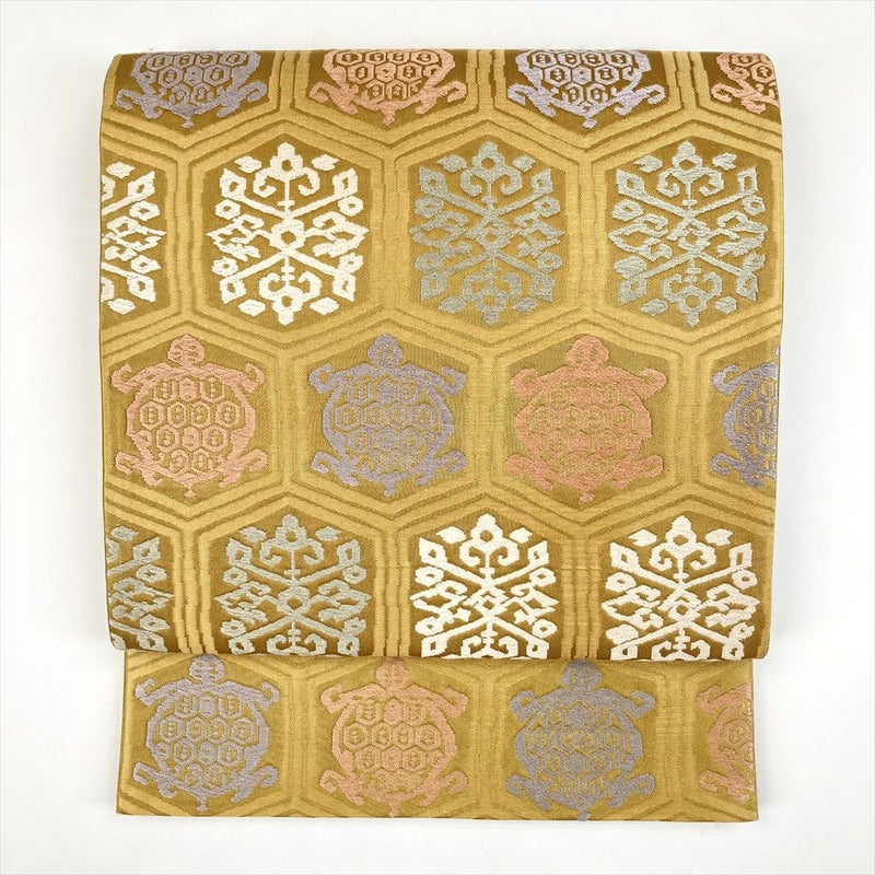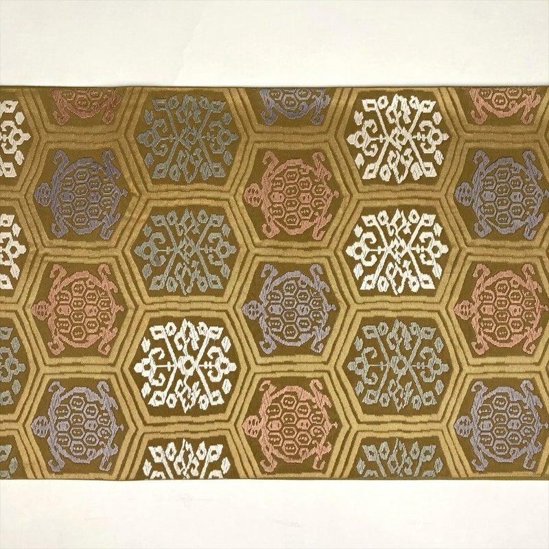 (中古)袋帯 サンドベージュ 黄土色 色糸 セミフォーマル カジュアル 六通 亀甲 亀