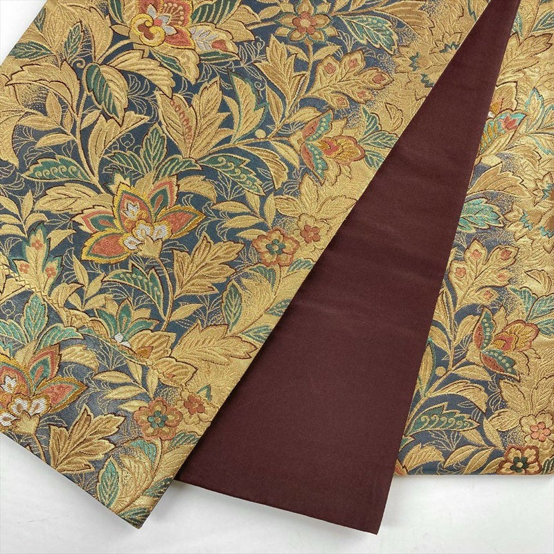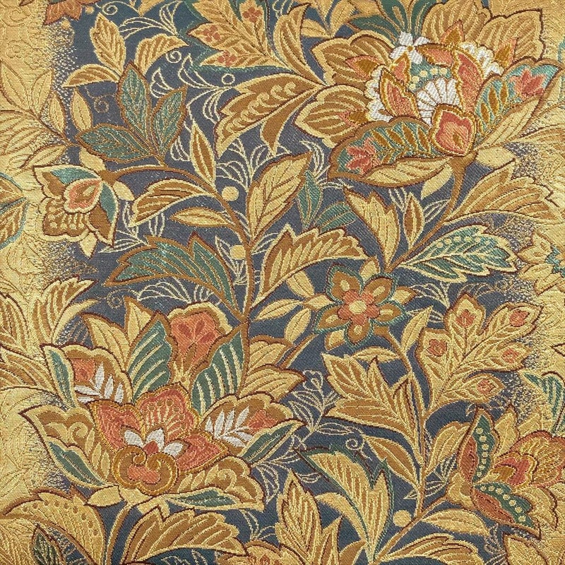 生地には程よい張りと柔らかさがあります、金色のオリエンタルな花柄が目を引き、晴れの日の装いを艶やかに彩ります。保存臭がややございます。