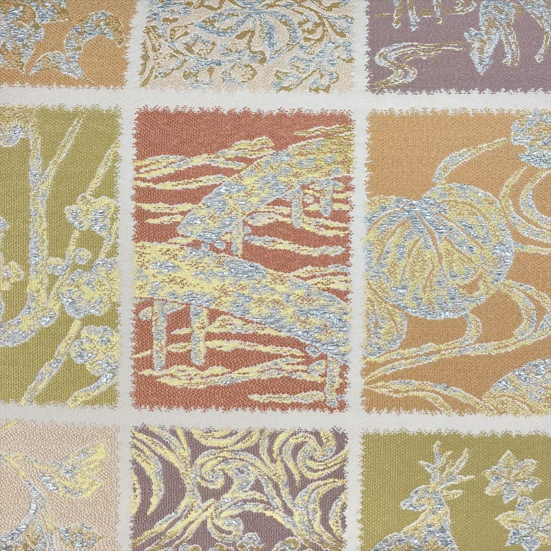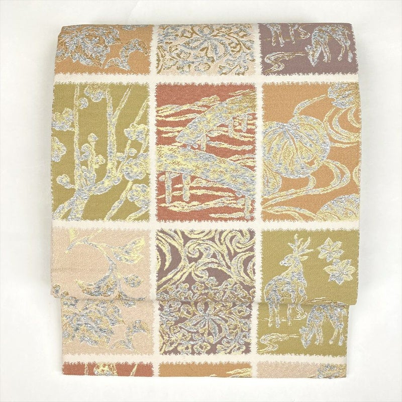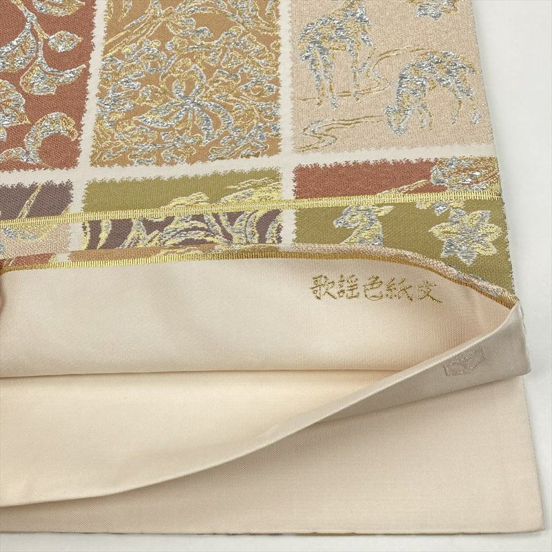 (中古)袋帯 生成り ベージュ セミフォーマル カジュアル 六通 歌謡色紙文 花唐草 水辺 紅葉と鹿 梅