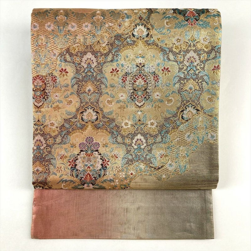 (中古)袋帯 金色 フォーマル 六通 織り 引き箔 金糸 色糸 華文 オリエンタル 未仕立て