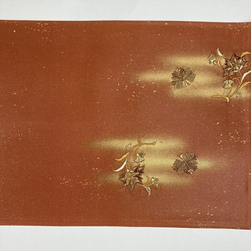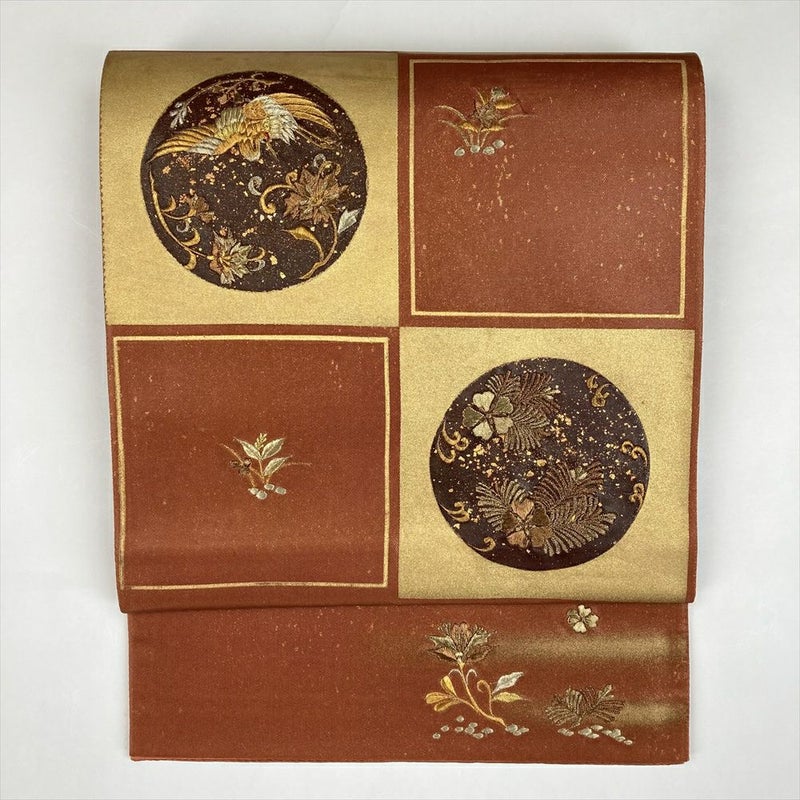 (中古)袋帯 テラコッタ オレンジ セミフォーマル 六通 金糸 銀糸 市松 丸に花鳥