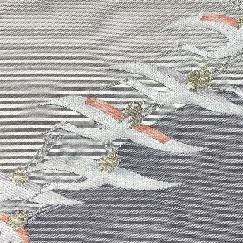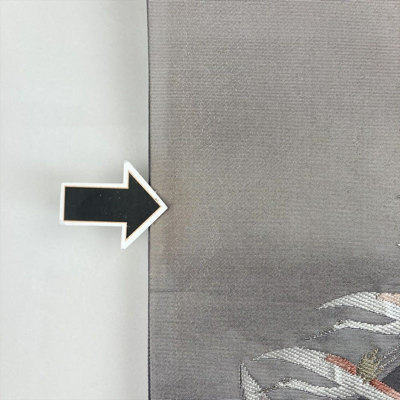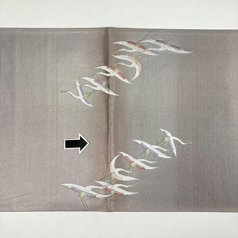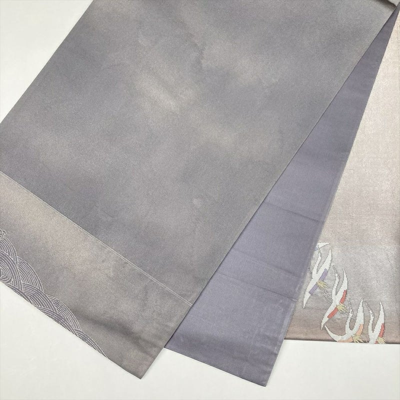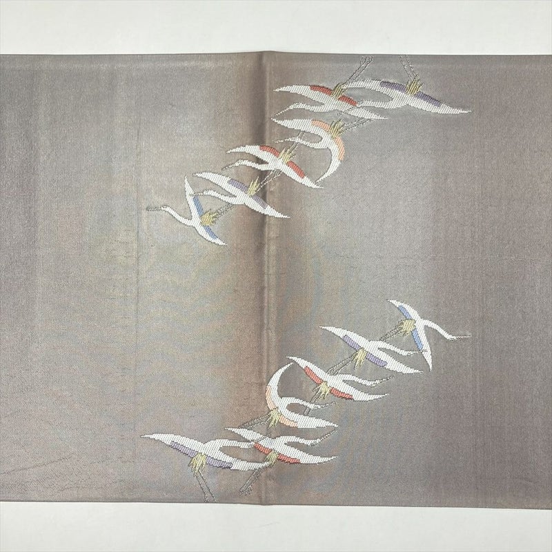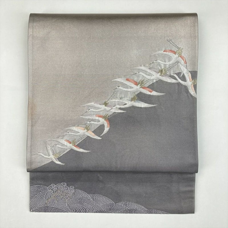 (中古)袋帯 銀 グレー セミフォーマル 六通 切箔 金糸 銀糸 色糸 鶴 琳派調