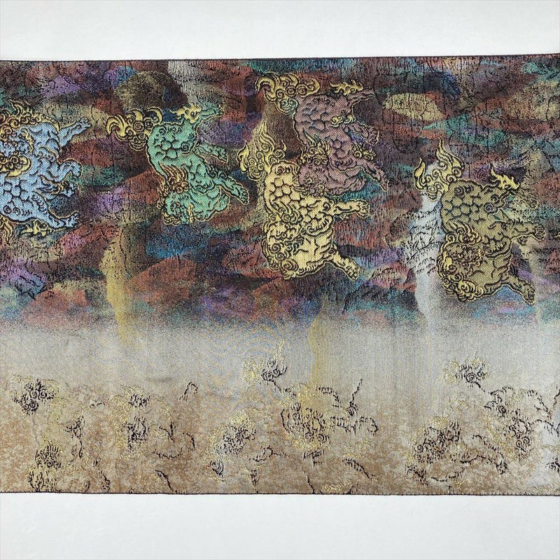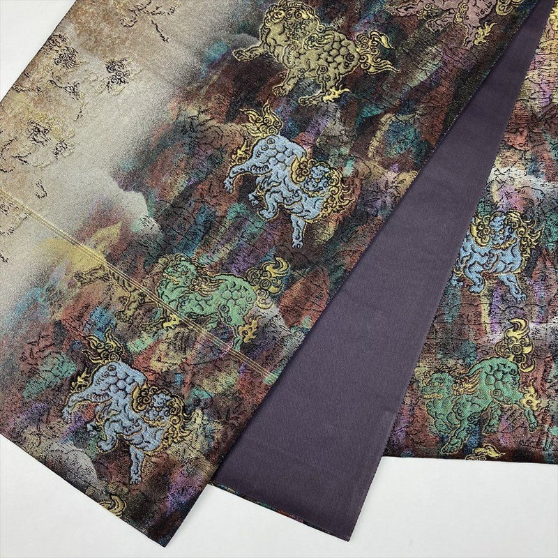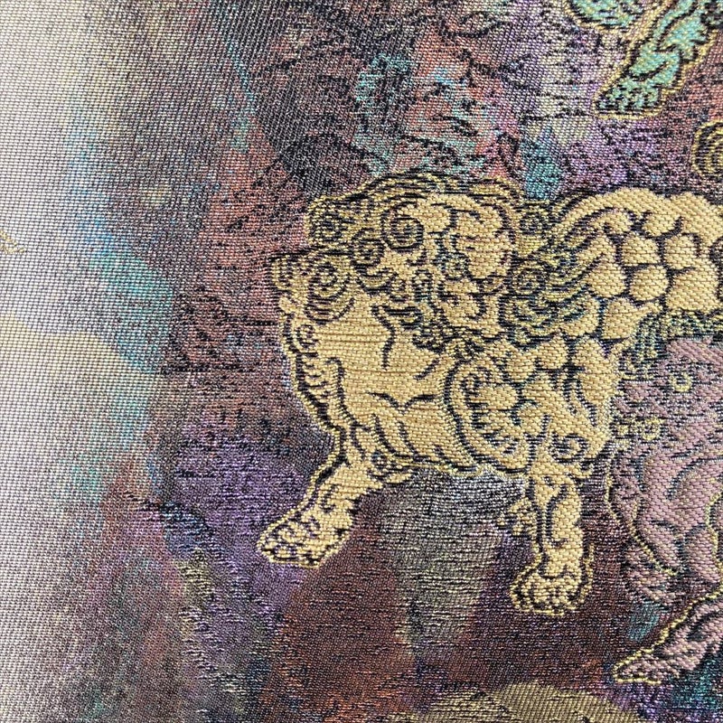 唐獅子には魔除け、厄除け、火難避け等の縁起があると云われ、縁起物の代表格となっています、セミフォーマルからカジュアルに合わせる、しゃれ帯です。保存臭がややございます。若干の使用感がございます。たれ裏に縫い取りがございます。