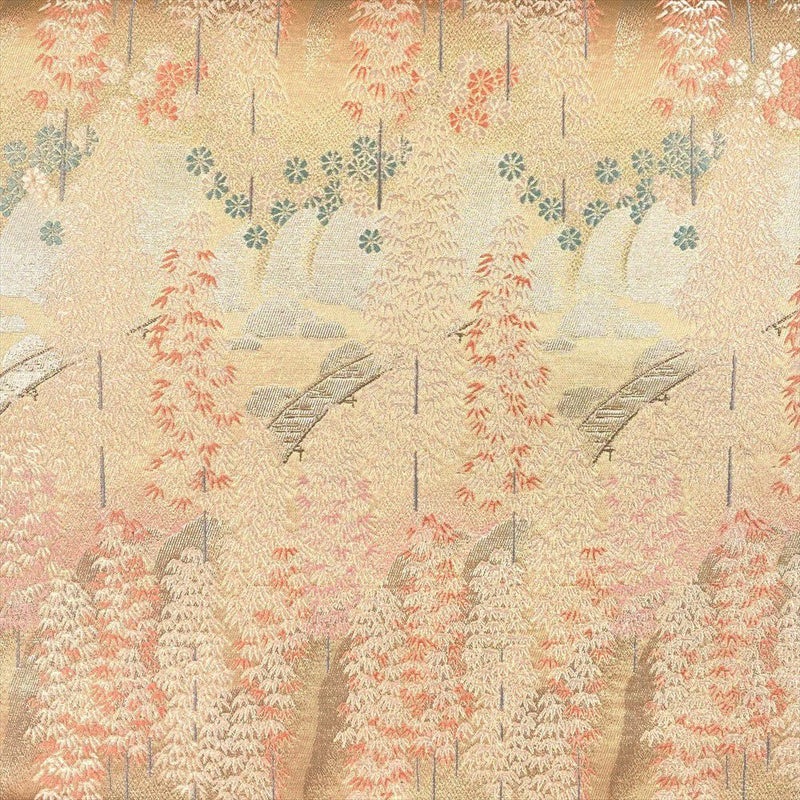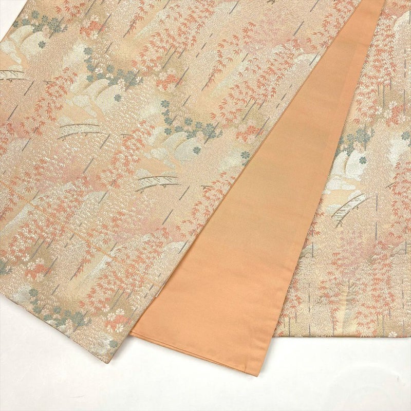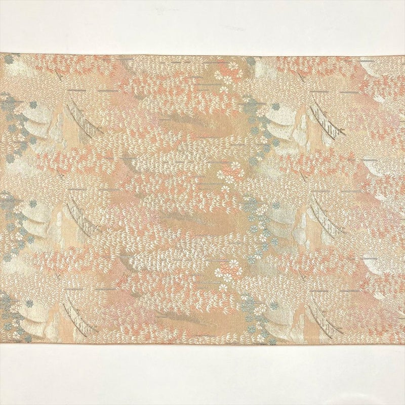 (中古)袋帯 シャーベットオレンジ セミフォーマル 六通 銀糸 色糸 橋のある景色