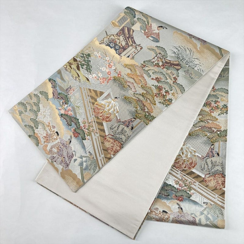 (中古)袋帯 銀 フォーマル セミフォーマル 六通 織り 王朝絵巻 姫 殿 絹