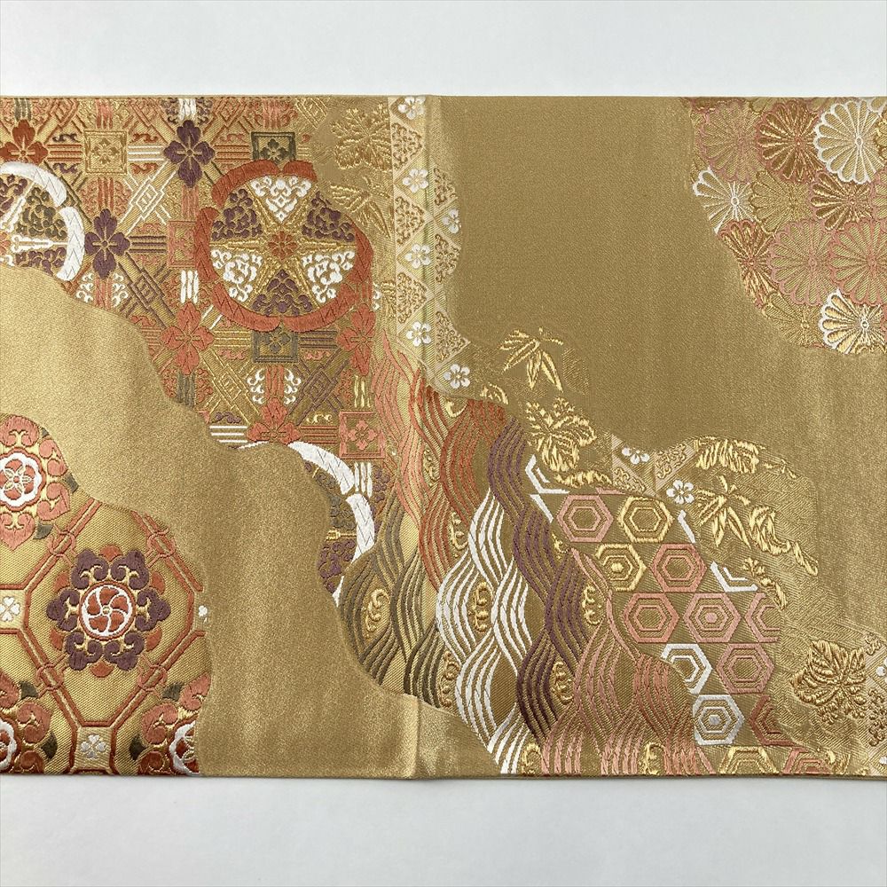 (中古)袋帯 金 セミフォーマル フォーマル 六通 織り 道長取り 吉祥文 絹