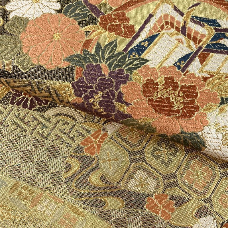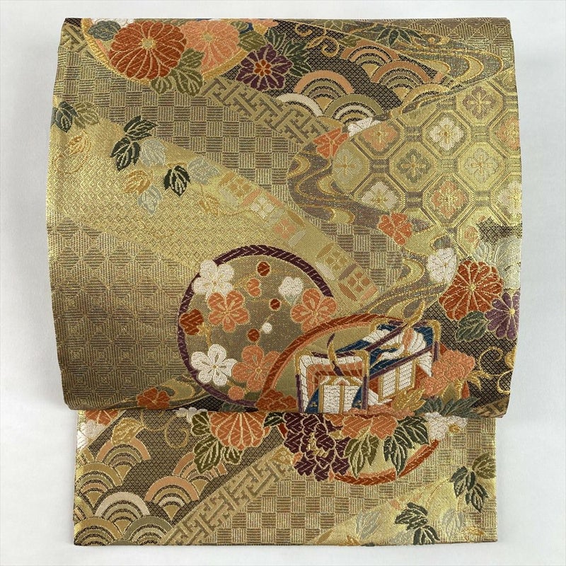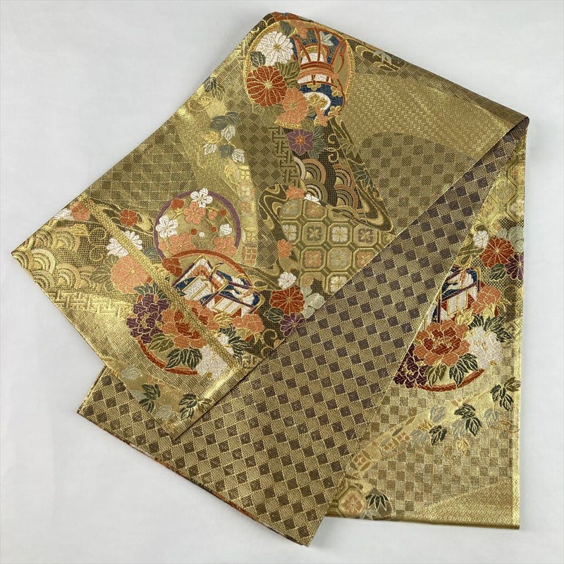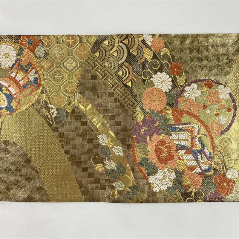 眩い金地に、四季の花々や御所車、鼓といった古典柄をモダンにアレンジした袋帯です。