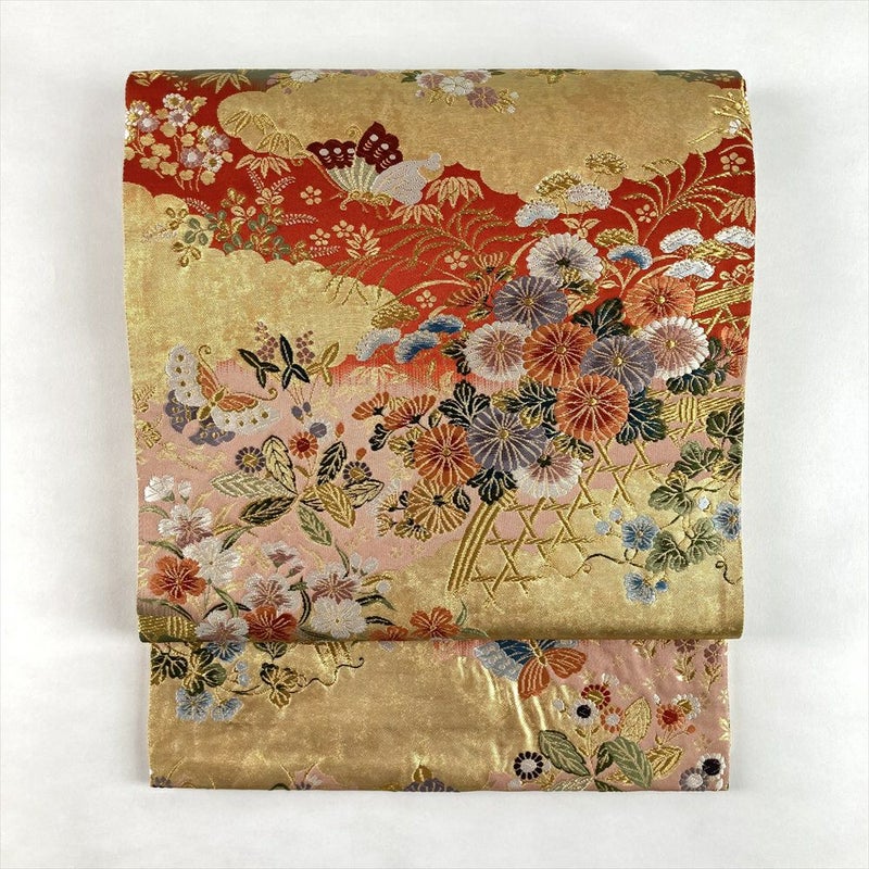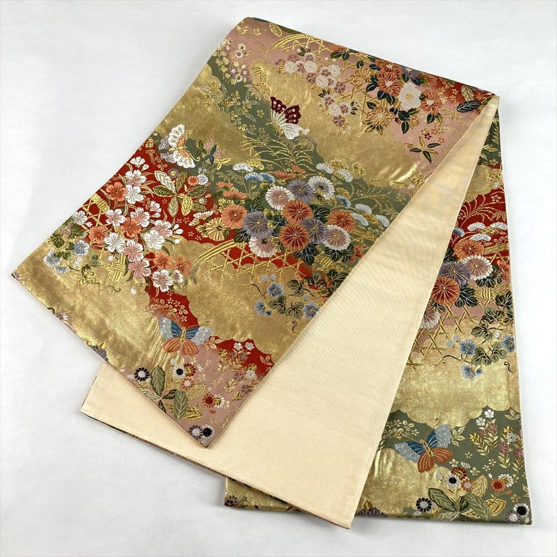 (中古)袋帯 金 フォーマル 六通 織り 雲取り 花蝶 絹