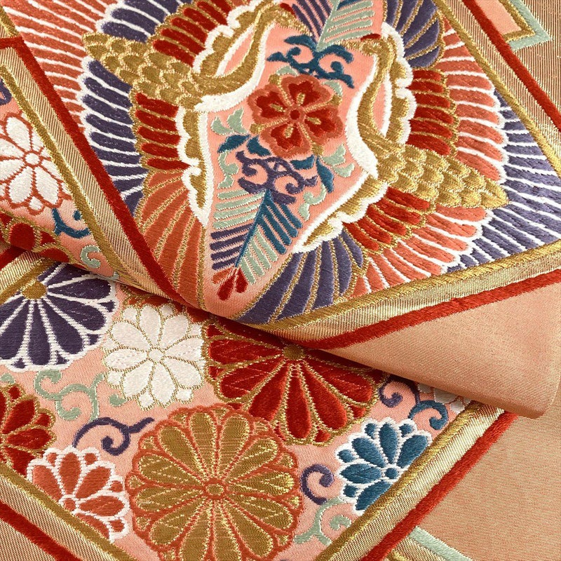 繊細な菱文様を背景に、長寿の向かい鶴、高貴な菊唐草、吉祥の七宝が贅沢に織り込まれています。