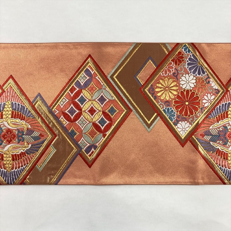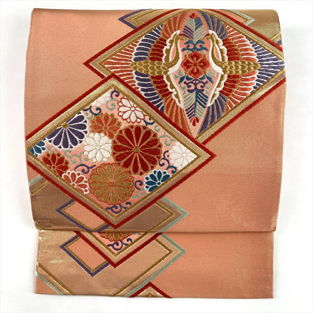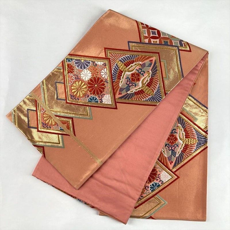 (中古)袋帯 珊瑚色 ピンク 金 フォーマル セミフォーマル 六通 金糸 色糸 菱 向かい鶴 菊唐草 絹