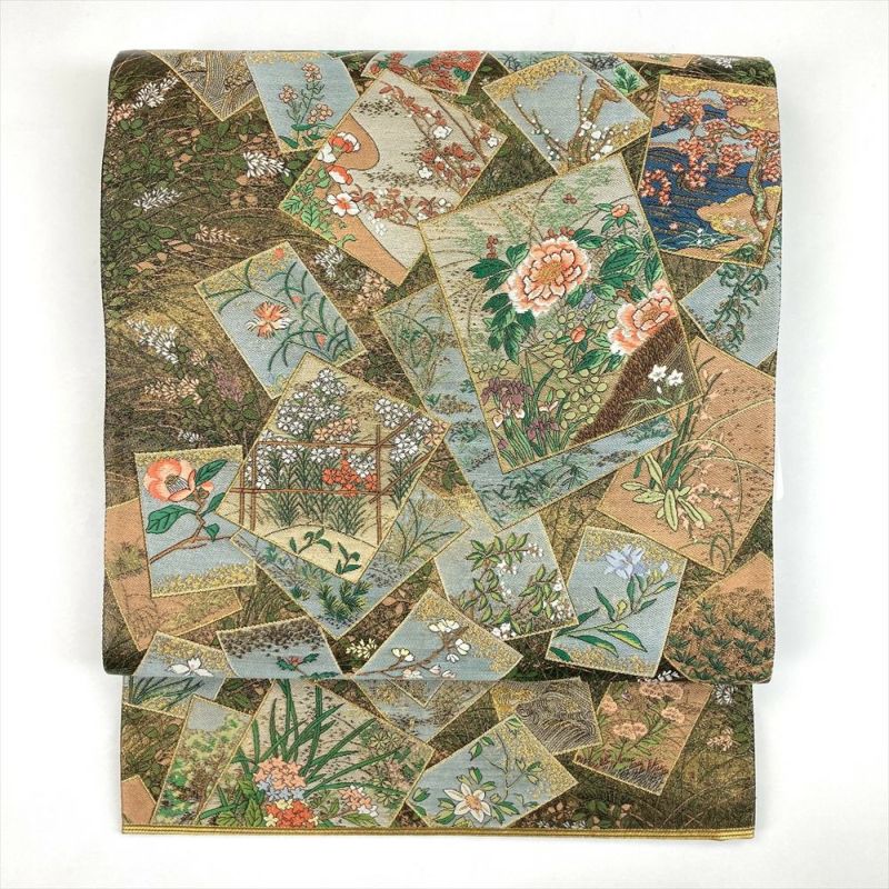 (中古)袋帯 錆色 フォーマル セミフォーマル 六通 切箔 金糸 色糸 御帳 四季花