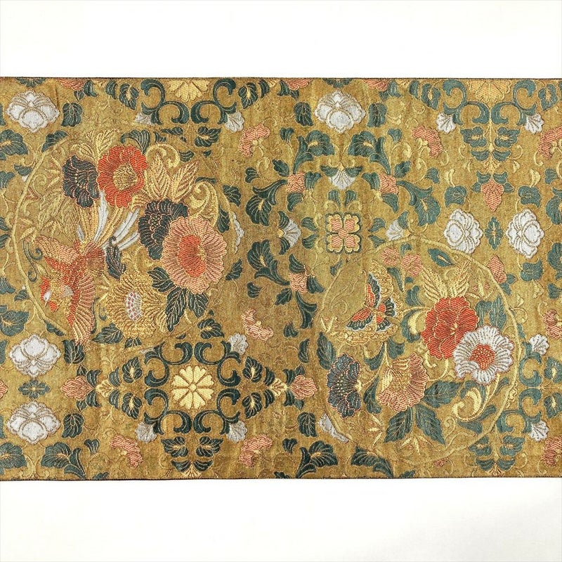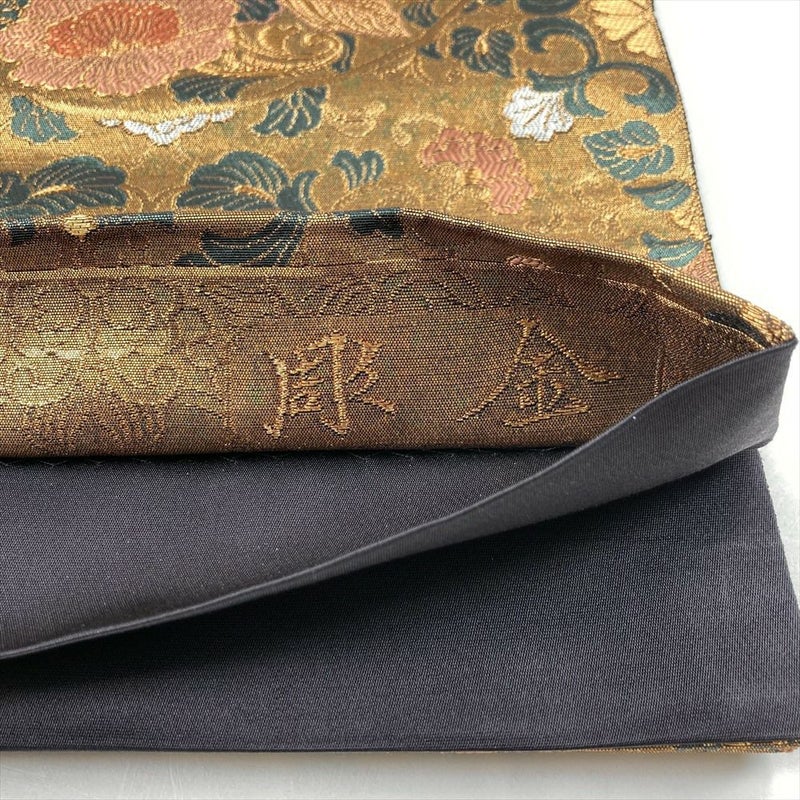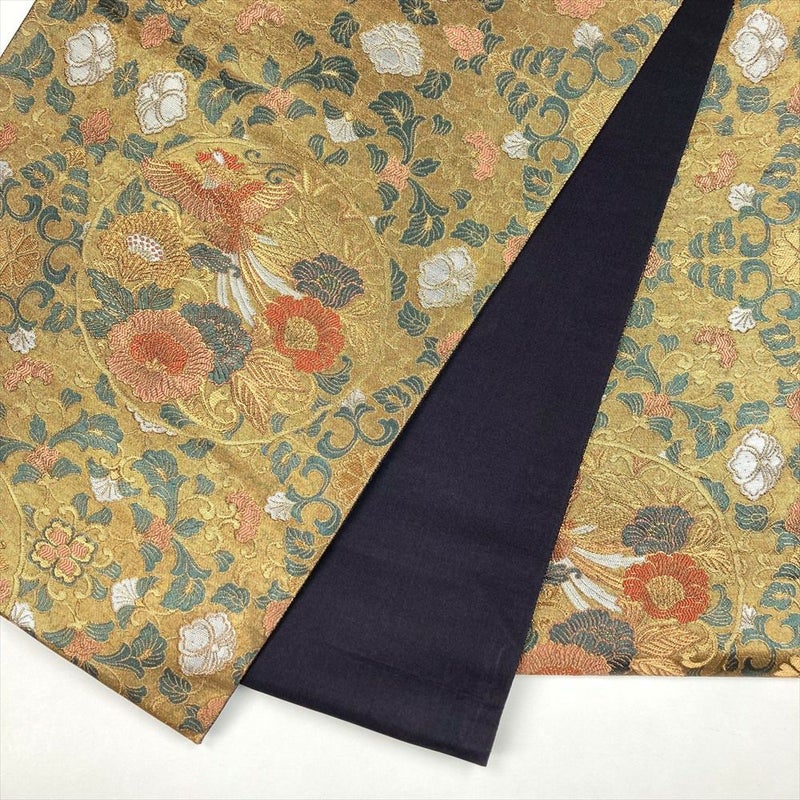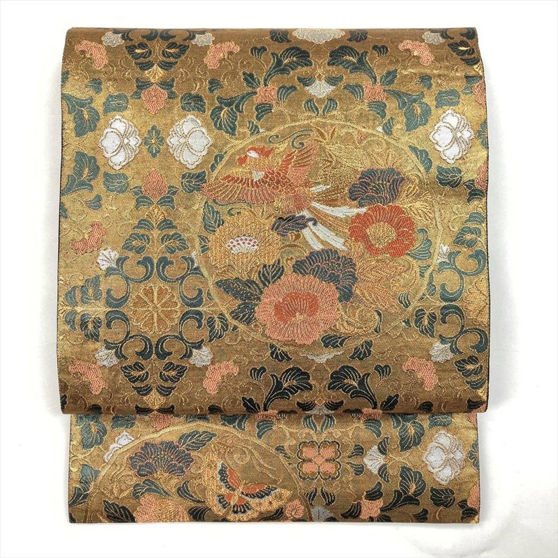 (中古)袋帯 金 フォーマル セミフォーマル 六通 切箔 カラー箔 鏡裏 花唐草 鳥 蝶