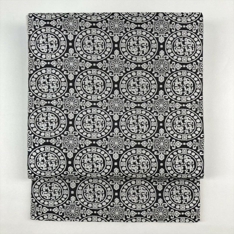 (中古)袋帯 黒色 白色 カジュアル 全通 織り 色糸 獅子狩文 オリエンタル
