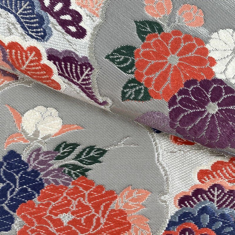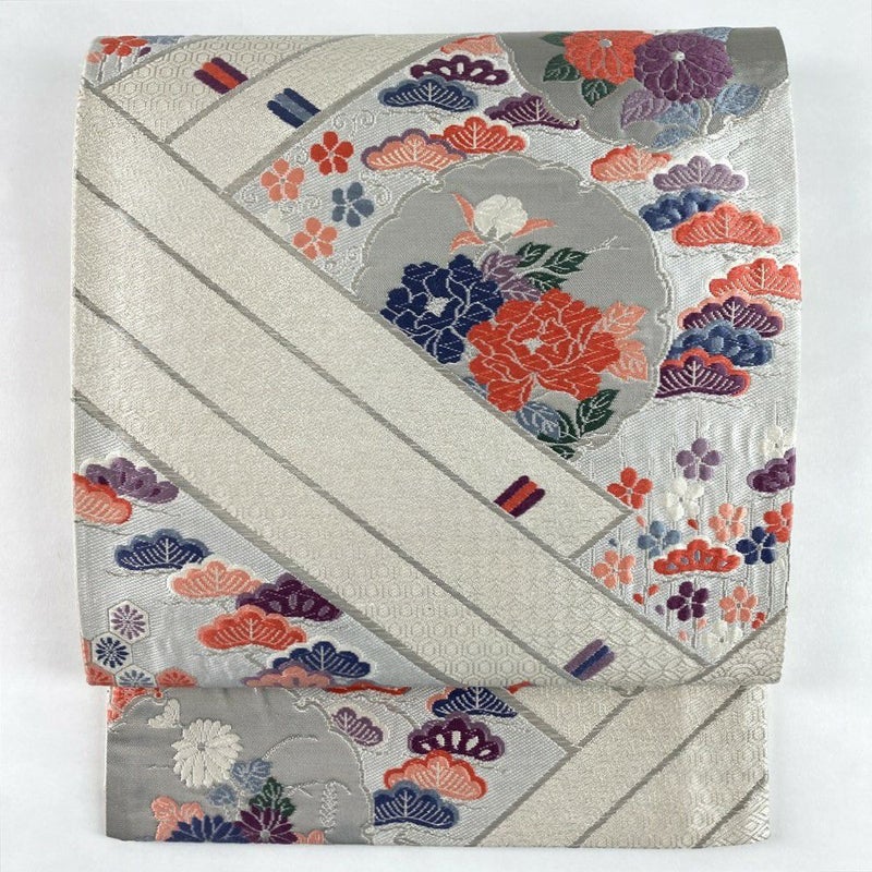 清楚な銀色の地に、檜扇と雪輪という格調高い吉祥文様が織り出された袋帯です。