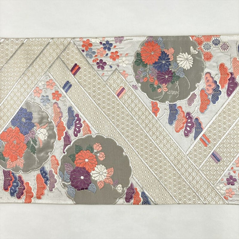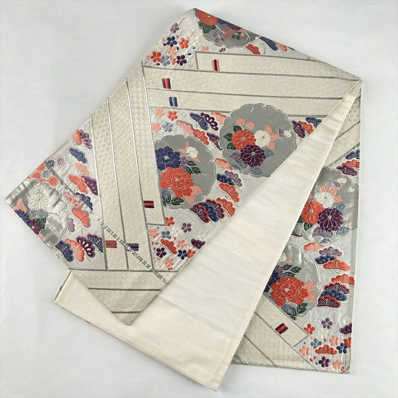 (中古)袋帯 銀 フォーマル セミフォーマル 六通 織り 檜扇 雪輪 四季花 絹
