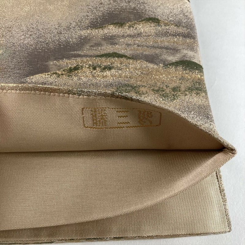 伝統工芸士・平田藤三郎作のフォーマル袋帯は、金色の地に桜や菊などの四季の花々が格調高く描かれています。