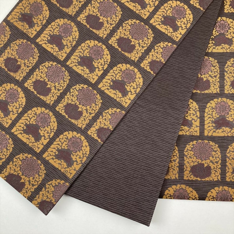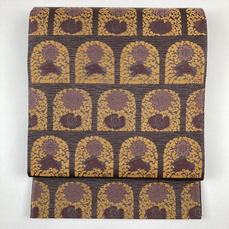 (中古)袋帯 紫 カジュアル 六通 横縞 名物裂 兎 牡丹