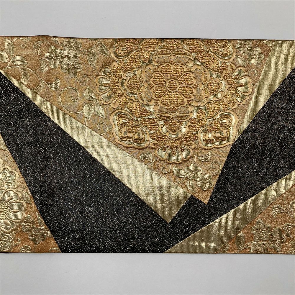 金×黒のシックでモダンな振袖用袋帯です。クールな感じのお着物に似合いそうです。小物とのコーディネートで、晴れの日の着こなしをお楽しみくださいませ。たれ先付近に糸飛び出しが見られます。裏地の手先からお太鼓にかけて折りジワが見られます。
