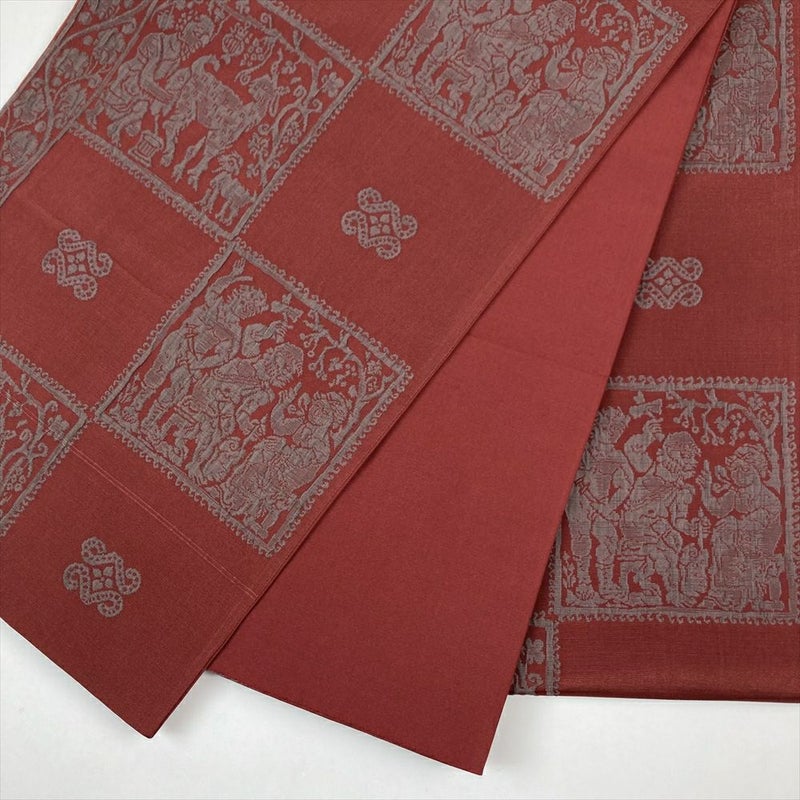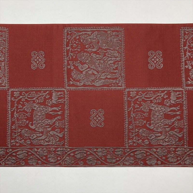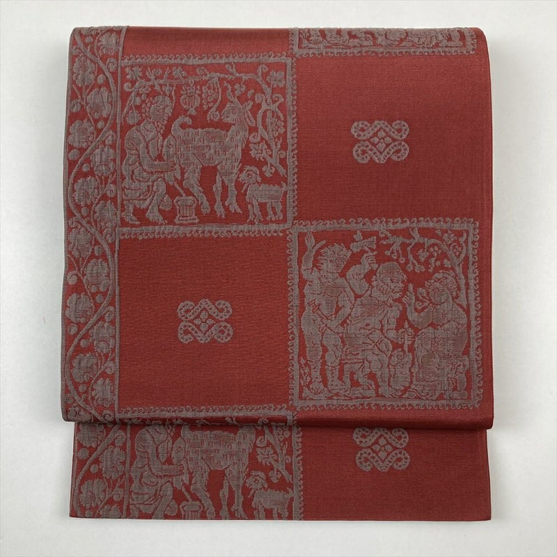 (中古)袋帯 赤 ボルドー カジュアル ふくれ織り 蔓花 人物 動物 オリエンタル 全通